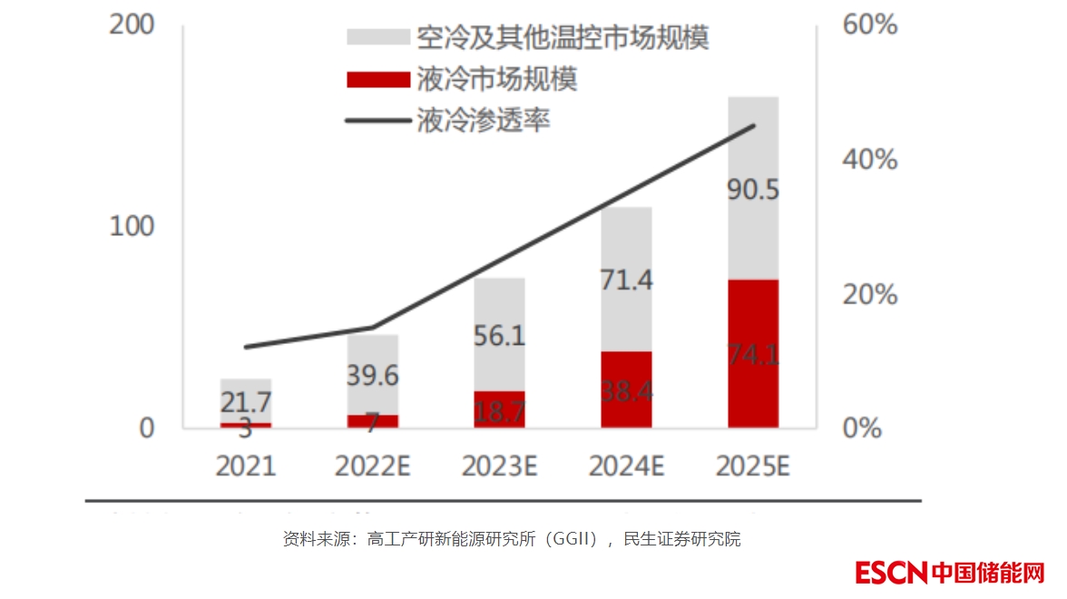 據(jù)統(tǒng)計,2022年,中國新增投運新型儲能項目達7.3GW/15.9GWh,累計裝機規(guī)模達13.1GW/27.1GWh。結(jié)合各地規(guī)劃情況,預(yù)計到2025年末,國內(nèi)儲能累計裝機規(guī)模有望達到近80GW。據(jù)高工產(chǎn)業(yè)研究院 (GGII)分析,2025年國內(nèi)儲能溫控出貨價值量將達到165億元隨著儲能能量和充放電倍率的提升,中高功率儲能產(chǎn)品使用液冷的占比將逐步提升,液冷有望成為未來主流方案,其中液冷技術(shù)到 2025 年滲透率有望達到 45%左右。