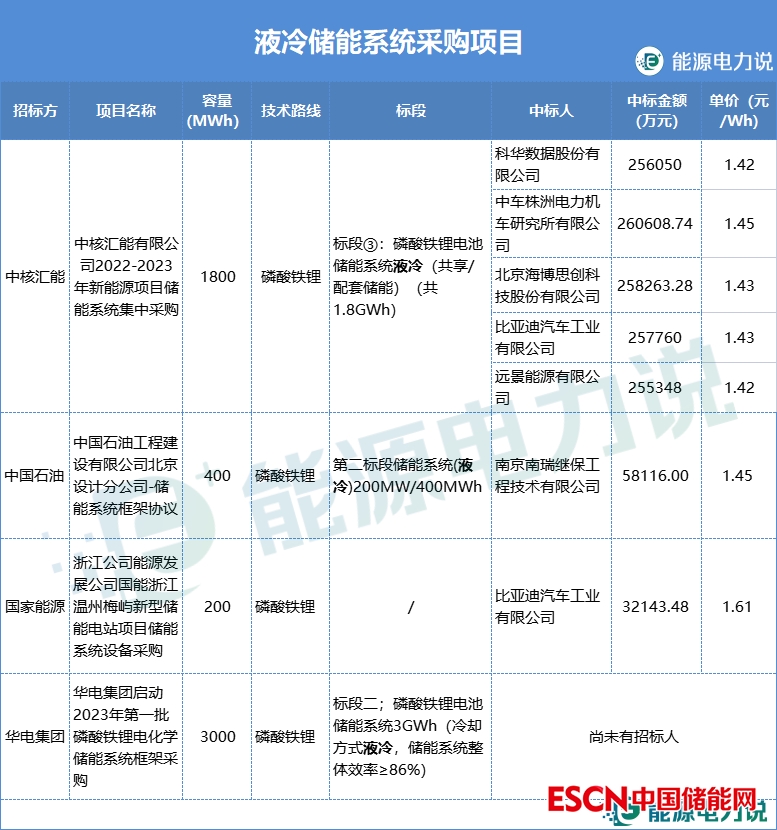 大型能源集團已經(jīng)開始液冷儲能系統(tǒng)的招標,據(jù)統(tǒng)計,中核集團、中石油、國家能源集團、華電集團等公司進行了液冷儲能系統(tǒng)采購項目,液冷系統(tǒng)規(guī)模約5.4GWh,采購單價在1.42元/Wh-1.61元/Wh。