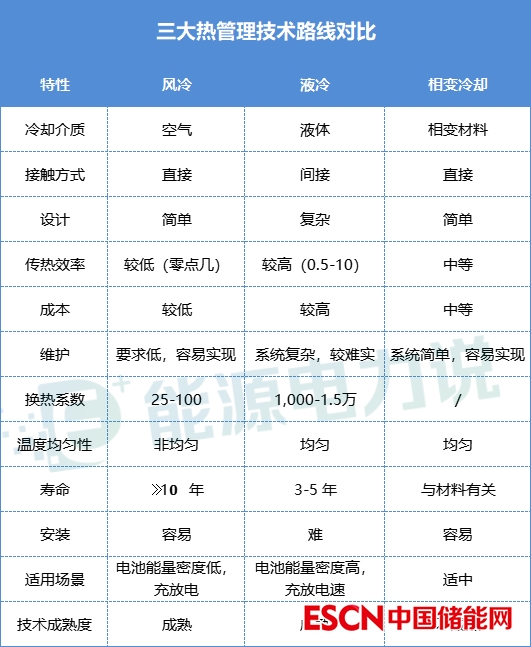 目前儲能熱管理的主流技術(shù)路線是風(fēng)冷和液冷。儲能熱管理技術(shù)路線主要分為風(fēng)冷、液冷、熱管冷卻、相變冷卻,其中熱管和相變冷卻技術(shù)尚未成熟。
