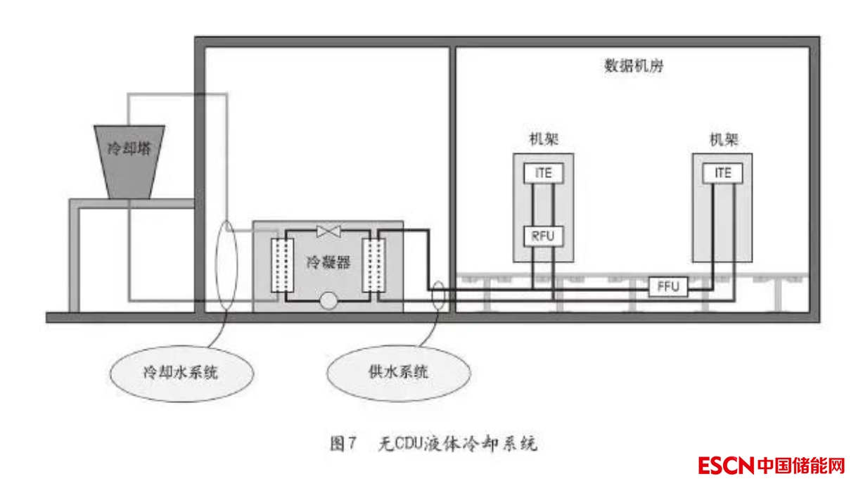 圖7為無(wú)CDU的液冷系統(tǒng)示意圖,該系統(tǒng)將冷凍水直接輸送到IT設(shè)備內(nèi)。ITE表示信息技術(shù)設(shè)備(通常是服務(wù)器硬件),RFU表示機(jī)架過(guò)濾單元,F(xiàn)FU表示設(shè)施過(guò)濾單元。
