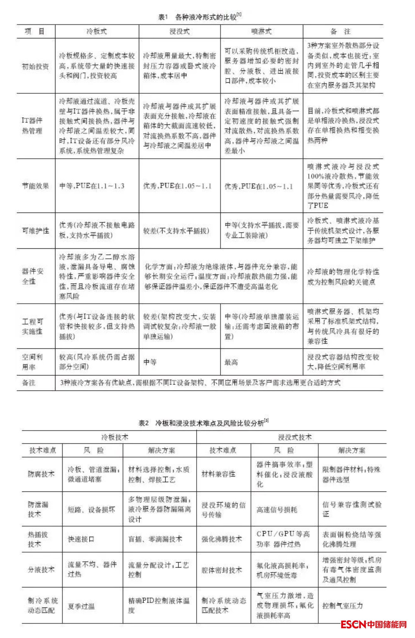 將幾種液冷形式進(jìn)行比較,如表1所示。目前,冷板式液冷和浸沒(méi)式液冷較為常用,噴淋水液冷應(yīng)用較少。現(xiàn)將冷板式和浸沒(méi)式液冷的技術(shù)難點(diǎn)和風(fēng)險(xiǎn)進(jìn)行比較分析,如表2所示。