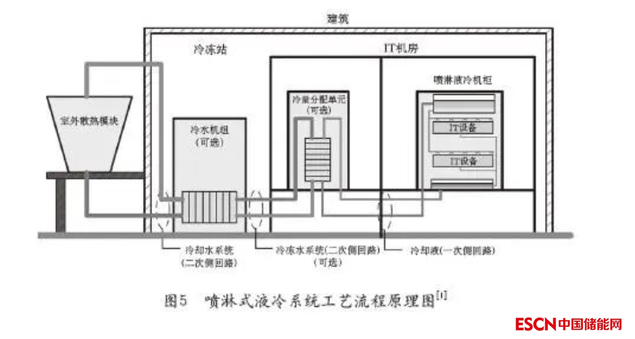 噴淋式液冷系統(tǒng)采用某種冷卻液并通過(guò)冷卻液直接或者間接吸熱帶走器件所釋放的廢熱至IDC外部環(huán)境進(jìn)行集中散熱的散熱形式。噴淋式液冷主要特征為絕緣非腐蝕特性的冷卻液直接噴淋到發(fā)熱器件表面或者是與發(fā)熱器件接觸的擴(kuò)展表面上吸熱后并排走,排走的熱流體通過(guò)直接與間接與外部環(huán)境大冷源進(jìn)行熱交換。