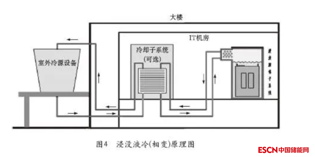 非相變浸沒(méi)式液冷技術(shù)原理是將IT設(shè)備直接浸沒(méi)在絕緣冷卻液中,冷卻液吸收IT設(shè)備產(chǎn)生的熱量后,通過(guò)循環(huán)將熱量傳遞給熱交換器中的水,然后通過(guò)水循環(huán)將熱量傳遞到室外散熱裝置。該技術(shù)由于服務(wù)器無(wú)風(fēng)扇設(shè)計(jì),噪音更低,噪音值可控制在45dB以下,同時(shí)省去了風(fēng)扇功耗,服務(wù)器整體耗電降低10%以上。如圖3所示為浸沒(méi)式液冷原理圖(非相變)。