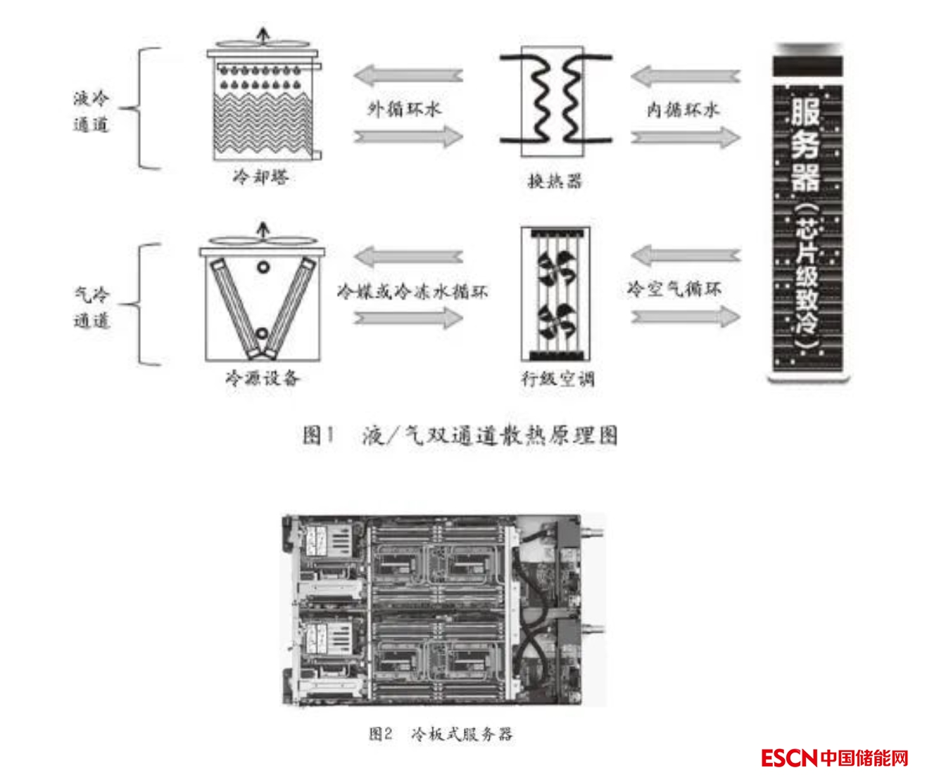冷板式液冷技術(shù)是在常規(guī)風(fēng)冷服務(wù)器基礎(chǔ)上,CPU和內(nèi)存?zhèn)染o貼一塊板式換熱器,芯片的熱量通過(guò)熱傳導(dǎo)至板內(nèi)流體,流體為絕緣介質(zhì),可為去離子水、乙二醇溶液、氟化液等、或相變的熱管(熱管通過(guò)換熱器將熱傳導(dǎo)至機(jī)房外水系統(tǒng))。冷卻的板片與服務(wù)器的PU/GPU(高熱流密度元件)通過(guò)直接接觸將服務(wù)器的主要熱量帶走(冷板內(nèi)有熱管和液體散熱兩種形式),其余部件(低熱流密度元件)熱量可通過(guò)較高溫的風(fēng)帶走,我們把這種由液冷和氣冷結(jié)合的散熱技術(shù)稱(chēng)為液/氣雙通道散熱技術(shù),原理如圖1所示。圖2所示為冷板式服務(wù)器外形。