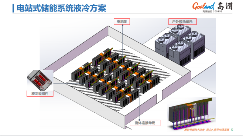 這是近期做的電站式儲能系統(tǒng)的總體液冷方案,可以看到在整個電站式儲能系統(tǒng)中,我們的分布大概跟剛才一樣,作為吸熱器件,在電池簇中,能夠吸熱的所有部件,就是液冷板的組件,到后面整個流體連接單元,以及戶外的換熱單元,這樣一個大致的系統(tǒng)構(gòu)成。