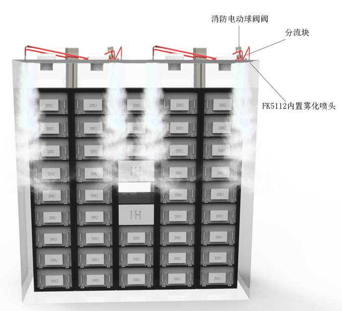 如果儲(chǔ)能方艙內(nèi)部多處電芯發(fā)生熱失控,在FK5112釋放完全之后,火災(zāi)/熱擴(kuò)散仍然沒有得到有效遏制,此時(shí)將觸發(fā)系統(tǒng)的三級(jí)告警,并且將外部二次細(xì)水霧儲(chǔ)液箱接入FK5112噴淋系統(tǒng),實(shí)現(xiàn)持續(xù)性火情抑制或者浸沒式處置。