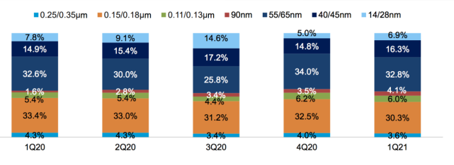 中芯國際2021年一季度各制程營收占比