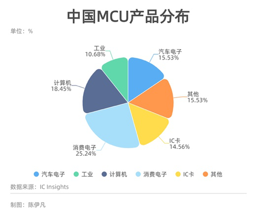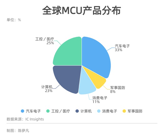據(jù)第三方市場調(diào)研機構(gòu)IC Insights數(shù)據(jù),2019年全球MCU下游應(yīng)用主要分布在汽車電子,其次是工控/醫(yī)療領(lǐng)域、然后是計算機和消費電子四大領(lǐng)域。而在中國,MCU的應(yīng)用主要集中在家電等品類,消費電子的占比最多,汽車電子的占比明顯低于全球的水平。