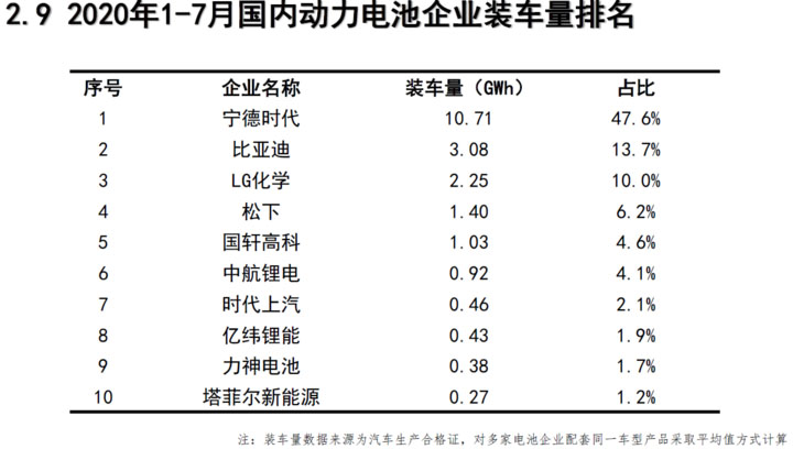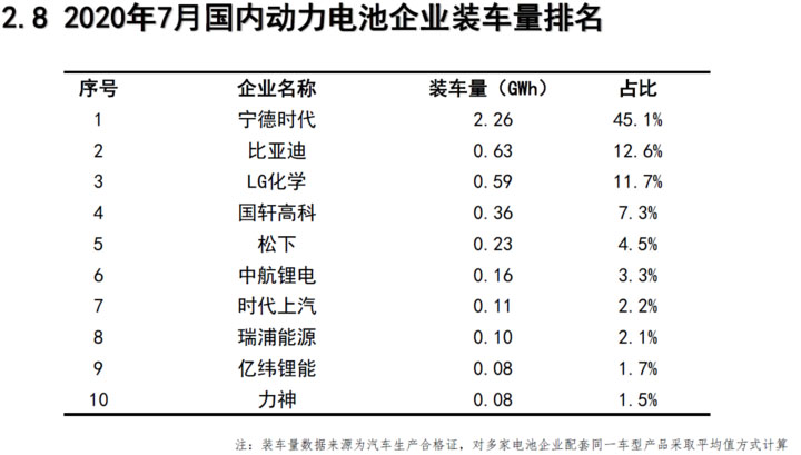 企業(yè)方面,2020年7月,我國新能源汽車市場共計45家動力電池企業(yè)實現(xiàn)裝車配套,較6月份減少3家。排名前3家、前5家、前10家動力電池企業(yè)動力電池裝車量分別為3.5GWh、4.1GWh和4.6GWh,占總裝車量比分別為69.4%、81.3%和91 .9%。