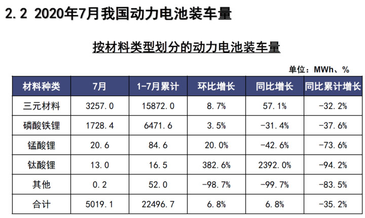 前7月,我國動力電池裝車量累計22.5GWh,同比累計下降35.2%。其中三元電池裝車量累計15.9GWh,占總裝車量70.6%,同比累計下降32.2%;磷酸鐵鋰電池裝車量累計6.5GWh,占總裝車量28.8%,同比累計下降37.6%。