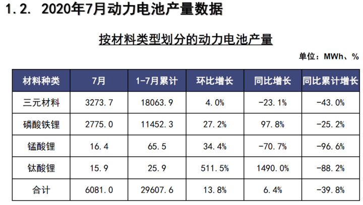 裝車量來看,2020年7月,我國動力電池裝車量5GWh,同環(huán)比均上升6.8%。其中三元電池共計裝車量3.3GWh,同比上升57.1%,環(huán)比上升8.7%;磷酸鐵鋰電池共計裝車量1.7GWh,同比下降31.4%,環(huán)比增長3.5%。