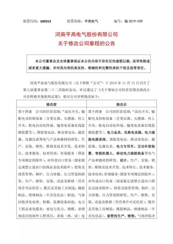 中國儲能網(wǎng)訊:11月15日晚間,平高電氣發(fā)布公告,公司董事會于當(dāng)日審議通過了《關(guān)于增加公司經(jīng)營范圍及修改公司章程相關(guān)條款的議案》,增加的營業(yè)范圍包括電力儲能電源系統(tǒng)、智能機(jī)器人和移動電力儲能裝備等項(xiàng)。