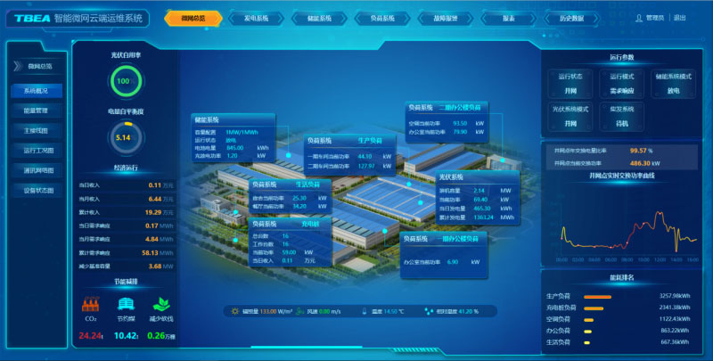 TEMSμ能量管理系統(tǒng)通過智能終端實現(xiàn)電網、光伏發(fā)電、負荷與儲能等環(huán)節(jié)的全景感知,全面監(jiān)測園區(qū)的發(fā)、用電情況;同時通過氣象數(shù)據與歷史數(shù)據精準預測光伏發(fā)電情況和負荷用能計劃,再通過儲能系統(tǒng)精確的充放電控制,最終實現(xiàn)園區(qū)源網荷儲協(xié)調控制,智能優(yōu)化調度園區(qū)用能,為工業(yè)園區(qū)生產、辦公和生活提供高可靠、低成本供電服務。