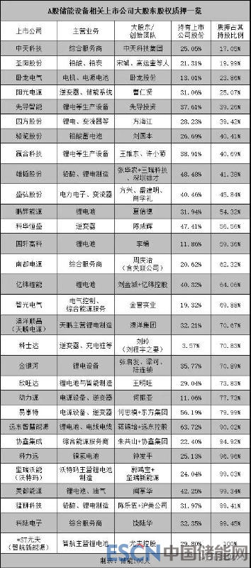 附30家A股儲(chǔ)能公司大股東股權(quán)質(zhì)押表