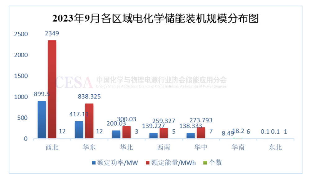 圖3 2023年8月各區(qū)域電化學儲能裝機規(guī)模分布圖