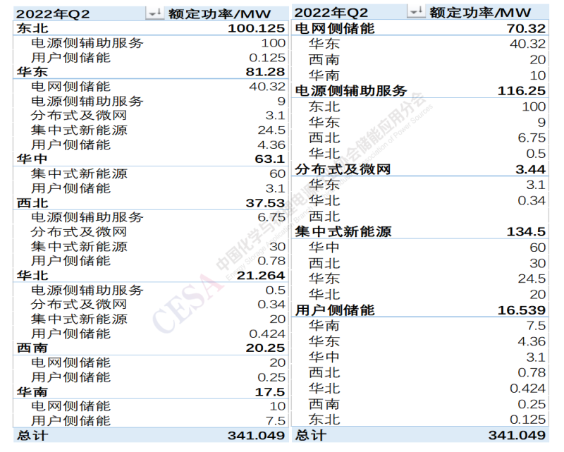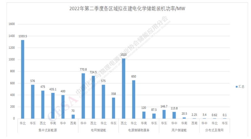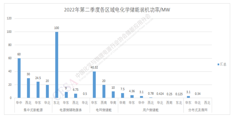 2022年第二季度電化學(xué)儲能項目裝機中集中式新能源、電網(wǎng)側(cè)儲能和電源側(cè)輔助服務(wù)占比最大,其中集中式新能源儲能在華中、西北、華東、華北都有一定比例,分布也較為均衡,電網(wǎng)側(cè)儲能主要集中在華東、西南、華南等區(qū)域,電源側(cè)輔助服務(wù)儲能分布東北區(qū)域占大頭。用戶側(cè)儲能裝機功率規(guī)模較小,但分布較廣,各個區(qū)域基本上都有用戶側(cè)儲能項目投運。
