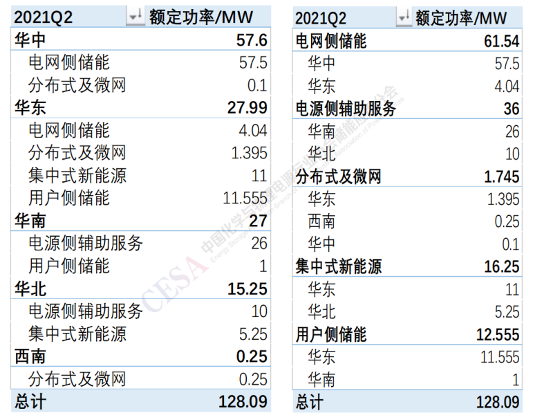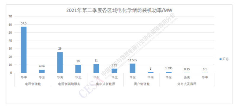 2021年第二季度電化學(xué)儲能項目裝機中電網(wǎng)側(cè)儲能主要集中在華中和華東區(qū)域,電源側(cè)輔助服務(wù)主要集中在華南和華北區(qū)域。