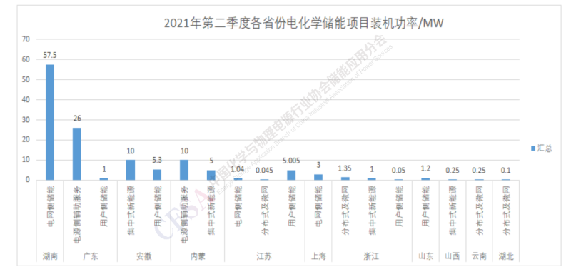 2021年第二季度電化學(xué)儲能裝機功率top5省份依次為湖南(4個)、廣東(2個)、安徽(2個)、內(nèi)蒙(2個)、江蘇(5個)