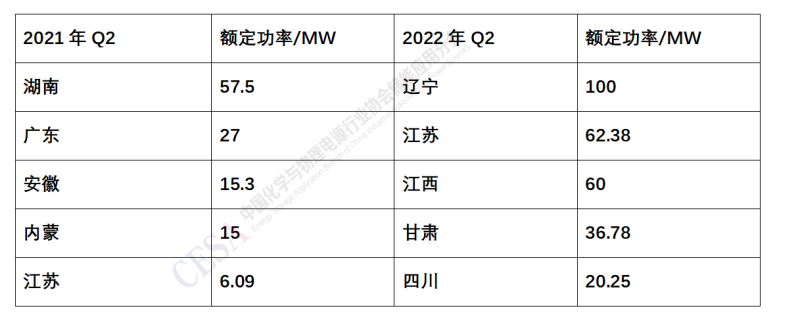 表1 2021Q2-2022Q2電化學(xué)儲能裝機功率TOP5省份
