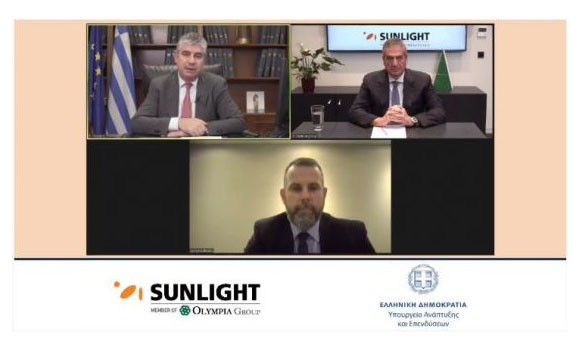 希臘發(fā)展與投資部副部長Yannis Tsakiris(左上)與Sunlight公司首席執(zhí)行官Lampros Bisalas召開視頻會議