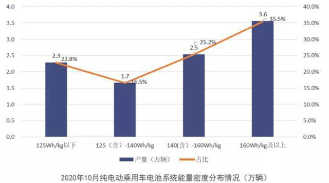 2020年10月,我國純電動乘用車系統(tǒng)能量密度在125Wh/kg以下和160Wh/kg以上車型產(chǎn)量分別為2.3萬輛和3.6萬輛,占比分別為22.8%和35.5%,125Wh/kg(含)-140Wh/kg以下車型產(chǎn)量占比達(dá)16.5%,較9月份上升7.9個百分點。