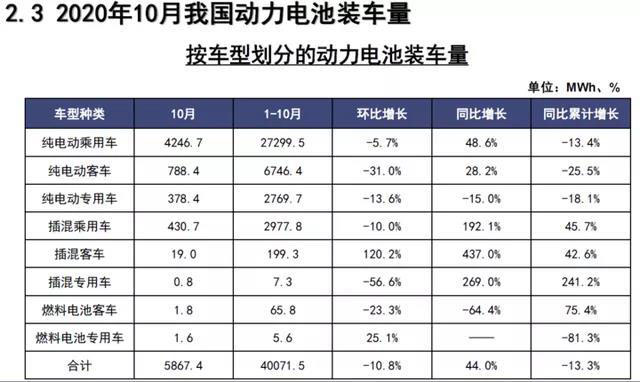 從單臺車平均裝車電量來看,2020年10月,我國新能源汽車按車型劃分的平均裝車電量44.1kWh,環(huán)比下降6.9%。其中純電動乘用車和純電動客車單車平均帶電量分別為42.3kWh/輛和201.6kWh/輛,環(huán)比分別下降5.8%和上升0.5%。