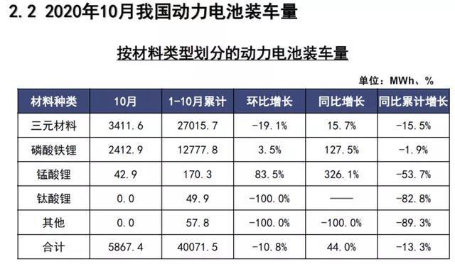 前10月,我國動力電池裝車量累計40GWh,同比累計下降13.3%。其中三元電池裝車量累計27GWh,占總裝車量67.4%,同比累計下降15.5%;磷酸鐵鋰電池裝車量累計12.8GWh,占總裝車量31.9%,同比累計下降1.9%,已逐漸追平去年同期水平。