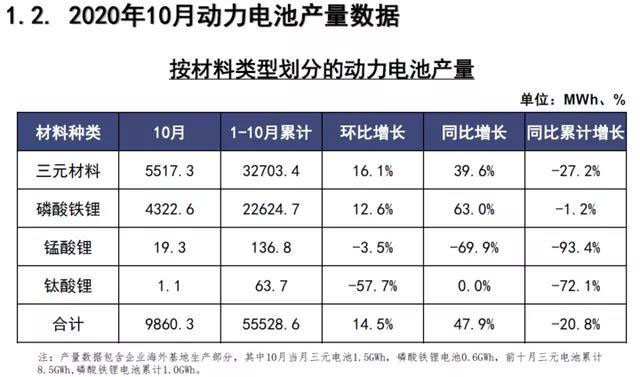 10月,我國動力電池裝車量5.9GWh,同比上升44%,環(huán)比下降10.8%,同比繼續(xù)保持增長趨勢。其中三元電池共計裝車3.4GWh,同比上升15.7%,環(huán)比下降19.1%;磷酸鐵鋰電池共計裝車2.4GWh,同比上升127.5%,環(huán)比上升3.5%。