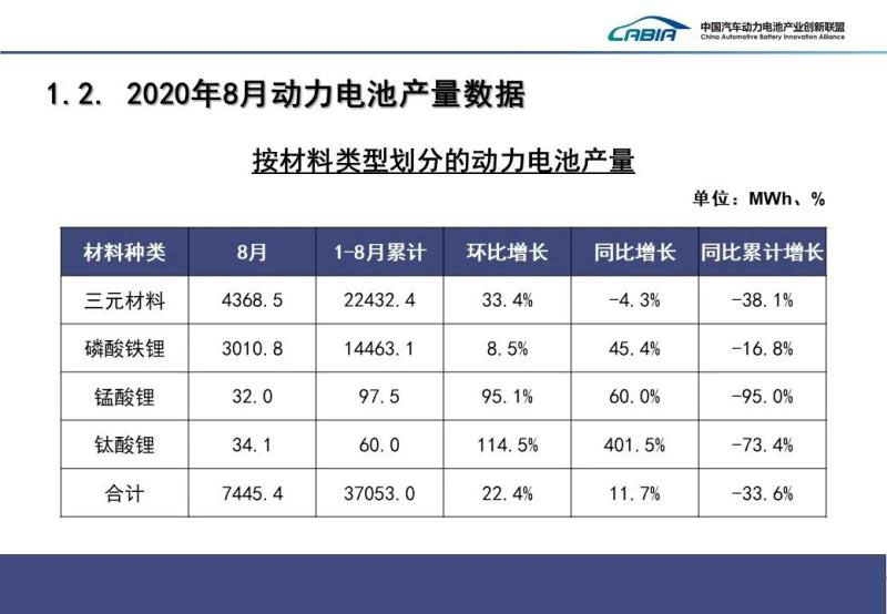 產(chǎn)量方面,2020年8月我國動力電池產(chǎn)量共計(jì)7.4GWh,同比增長11.7%,環(huán)比增長22.4%。其中三元電池產(chǎn)量4.4GWh,占總產(chǎn)量58.7%,同比下降4.3%,環(huán)比增長33.4%;磷酸鐵鋰電池產(chǎn)量3.0GWh,占總產(chǎn)量40.4%,同比增長45.4%,環(huán)比增長8.5%。1-8月,我國動力電池產(chǎn)量累計(jì)37.1GWh,同比累計(jì)下降33.6%。其中三元電池產(chǎn)量累計(jì)22.4GWh,占總產(chǎn)量60.5%,同比累計(jì)下降38.1%;磷酸鐵鋰電池產(chǎn)量累計(jì)14.5GWh,占總產(chǎn)量39.0%,同比累計(jì)下降16.8%。