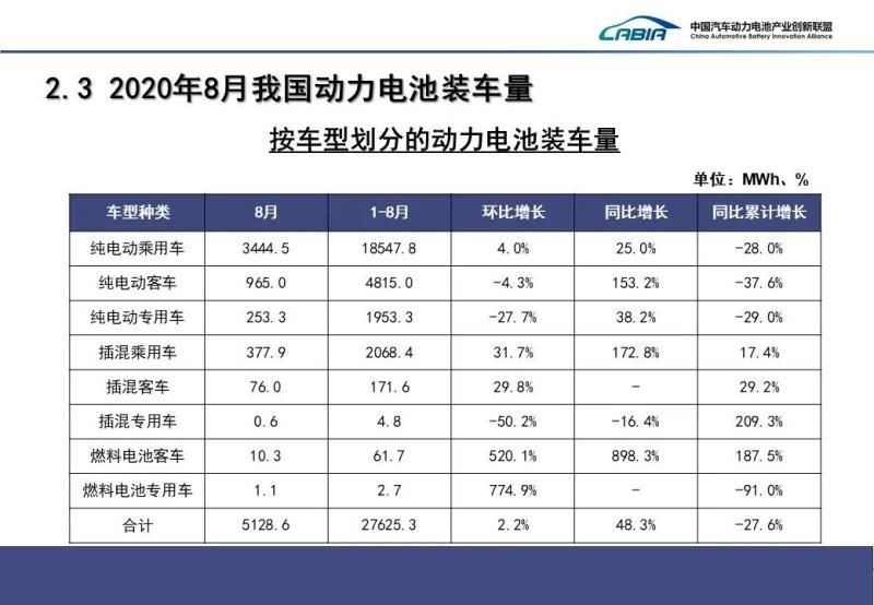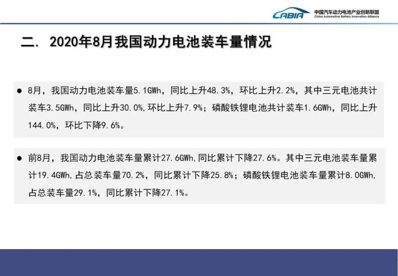 裝車量方面,2020年8月我國動力電池裝車量5.1GWh,同比上升48.3%,環(huán)比上升2.2%,其中三元電池共計(jì)裝車3.5GWh,同比上升30.0%,環(huán)比上升7.9%;磷酸鐵鋰電池共計(jì)裝車1.6GWh,同比上升144.0%,環(huán)比下降9.6%。1-8月,我國動力電池裝車量累計(jì)27.6GWh,同比累計(jì)下降27.6%。其中三元電池裝車量累計(jì)19.4GWh,占總裝車量70.2%,同比累計(jì)下降25.8%;磷酸鐵鋰電池裝車量累計(jì)8.0GWh,占總裝車量29.1%,同比累計(jì)下降27.1%。