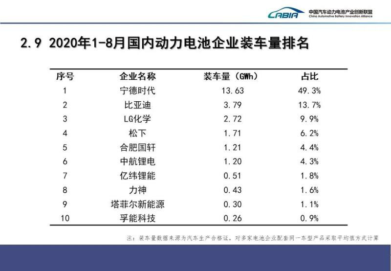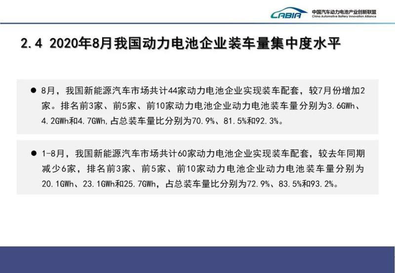 企業(yè)集中度水平,2020年8月我國新能源汽車市場共計(jì)44家動力電池企業(yè)實(shí)現(xiàn)裝車配套,較7月份增加2家。排名前3家、前5家、前10家動力電池企業(yè)動力電池裝車量分別為3.6GWh、4.2GWh和4.7GWh,占總裝車量比分別為70.9%、81.5%和92.3%。