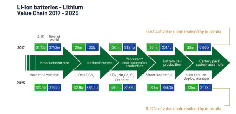 根據(jù)評估結果,盡管澳大利亞已經(jīng)占據(jù)了電池生產(chǎn)原料供應市場的很大一部分,但澳大利亞卻錯失了包括材料提煉在內的下游加工以及電池生產(chǎn)和組裝等更大的市場機會。