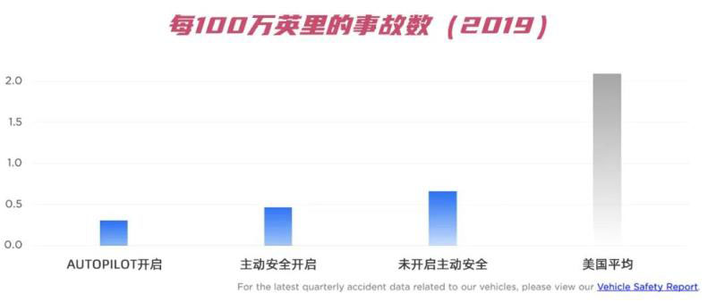 2019年,在美國(guó),一輛參與自動(dòng)駕駛的特斯拉汽車每行駛100萬(wàn)英里發(fā)生0.3起事故,而美國(guó)的平均水平則高出約6倍,平均每100萬(wàn)英里2起事故。即使在只啟用主動(dòng)安全功能的情況下,特斯拉車輛在2019年的碰撞率也比美國(guó)平均水平低4.5倍。