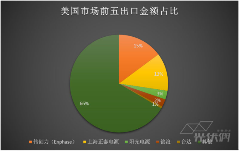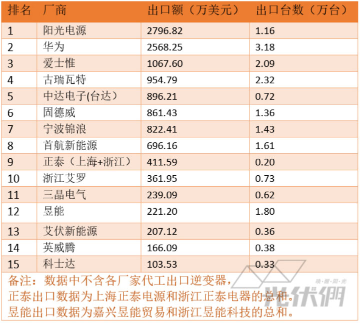 從企業(yè)的出口金額來看,陽光電源、華為分別以相差不大的2796萬美元和2568萬美元出口額排在前兩位,今年首次打入前三的愛士惟達(dá)到了出口金額1067萬美元。古瑞瓦特和臺(tái)達(dá)分別以954萬美元和896萬美元緊隨其后,排在第四和第五。