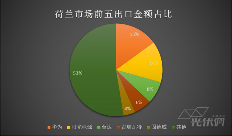 按照具體市場(chǎng)分析,荷蘭的出口比例能夠看到國內(nèi)逆變器廠商的競(jìng)爭程度,華為、陽光電源、臺(tái)達(dá)、古瑞瓦特和固德威占據(jù)荷蘭市場(chǎng)出口前五,錦浪、三晶電氣、首航新能源緊隨其后。