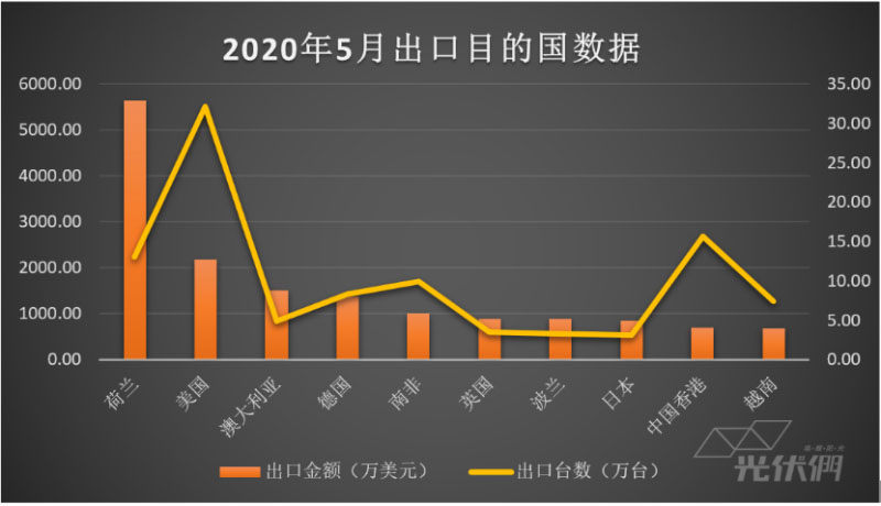 從出口國來看,荷蘭依舊保持第一大出口目的國,占據(jù)全部出口數(shù)據(jù)的24.71%,比上個(gè)月上升了四個(gè)百分點(diǎn),美國、澳大利亞、德國、南非、英國、波蘭、日本、香港和越南也進(jìn)入了排名前十。南非、英國和波蘭的出口金額增長明顯,分別排在第五到第七。波蘭1-4月光伏裝機(jī)總量達(dá)533.2MW,本地電網(wǎng)運(yùn)營商PSE表示,截至2020年4月波蘭累計(jì)光伏裝機(jī)量到1.83GW。