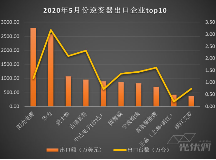 前10家光伏逆變器企業(yè)的出口金額占出口總額的50%,其中陽光電源、華為、愛士惟、古瑞瓦特和中達(dá)電子(臺(tái)達(dá))位列五月份出口前五名。