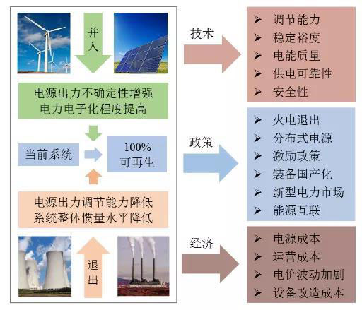 100% REPS相較于高比例可再生能源電力系統(tǒng),主要區(qū)別在于后者可以在電網(wǎng)中保留有一定容量的常規(guī)火電機(jī)組,用以保證系統(tǒng)的安全穩(wěn)定及調(diào)節(jié)能力等需求。而100% REPS中,常規(guī)火電機(jī)組將完全關(guān)停。由火電機(jī)組退出和用電負(fù)荷增長(zhǎng)帶來的電力電量不平衡問題,常需通過裝機(jī)、并網(wǎng)更多的風(fēng)電/光伏這類隨機(jī)性/間歇性電源加以解決,但這將給系統(tǒng)帶來多方面的嚴(yán)峻挑戰(zhàn)。