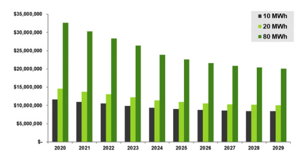 電網(wǎng)規(guī)模的鋰離子電池儲(chǔ)能系統(tǒng)的總安裝成本,以持續(xù)放電時(shí)間為0.5h、1h和4h的裝機(jī)容量為20MW電池儲(chǔ)能系統(tǒng)為例。這個(gè)圖表基于全球平均值的基本情況。