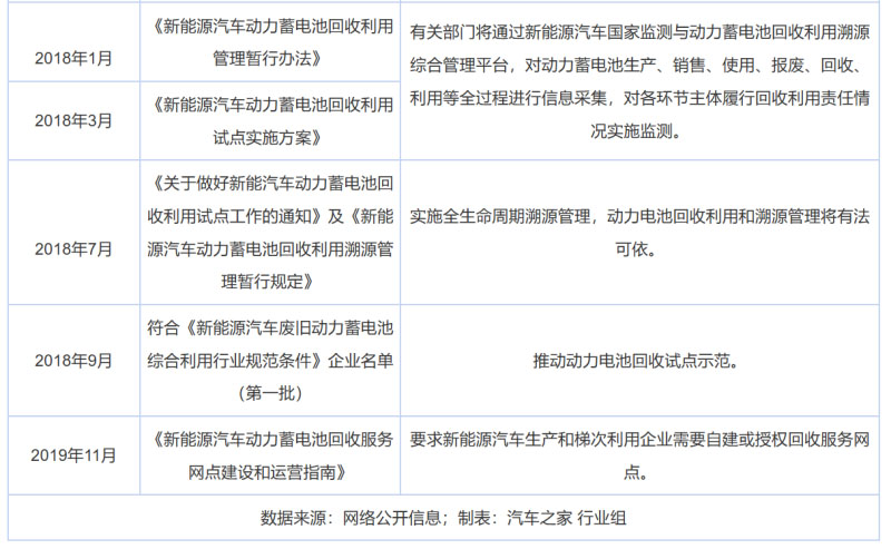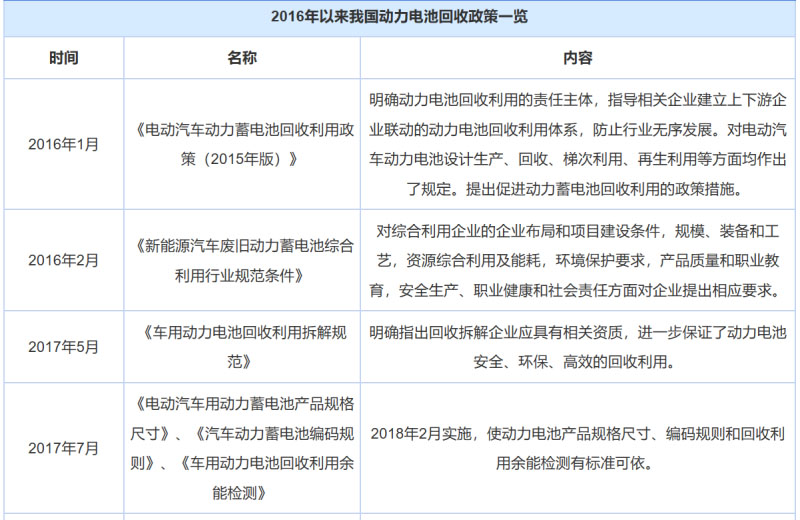 2018年7月底,工信部就公布首批符合《新能源汽車廢舊動力蓄電池綜合利用行業(yè)規(guī)范條件》(簡稱《規(guī)范條件》)企業(yè)名單。2020年1月,工信部發(fā)布《規(guī)范條件(2019年本)》,對動力電池回收企業(yè)申報條件提出更多的要求。未來,會有更多符合電池回收條件的“白名單”企業(yè)。