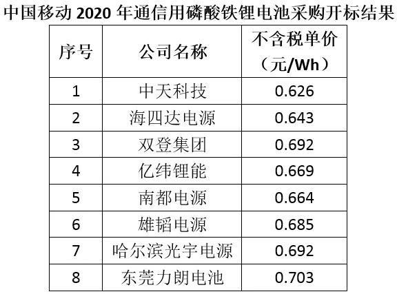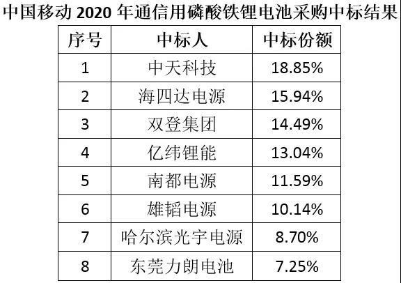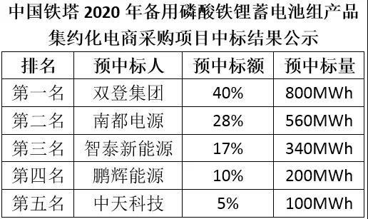 5月25日,中國鐵塔公布《2020年備用磷酸鐵鋰蓄電池組產(chǎn)品集約化電商采購項(xiàng)目中標(biāo)結(jié)果公示》,雙登集團(tuán)、南都電源、智泰新能源、鵬輝能源和中天科技5家企業(yè)預(yù)中標(biāo)。