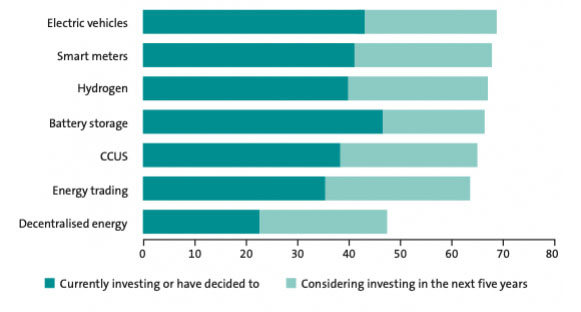 智能電表和氫儲(chǔ)能在當(dāng)前和計(jì)劃投資模式中也表現(xiàn)突出,分別有41%和40%的受訪者選擇這兩種非發(fā)電能源技術(shù)。