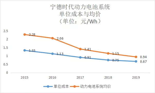 此外,動(dòng)力電池龐大的規(guī)模效應(yīng)也在帶動(dòng)儲(chǔ)能系統(tǒng)成本節(jié)節(jié)走低。2019年,寧德時(shí)代動(dòng)力電池系統(tǒng)單位成本仍在下降。通過動(dòng)力電池的營業(yè)成本和銷量來看,寧德全年出貨的動(dòng)力電池銷售價(jià)格已下降至1.08元/wh,其中2019年Q4出貨均價(jià)已降至0.9元/wh,動(dòng)力電池系統(tǒng)的單位成本為0.67元/wh,同比降幅為10.7%。