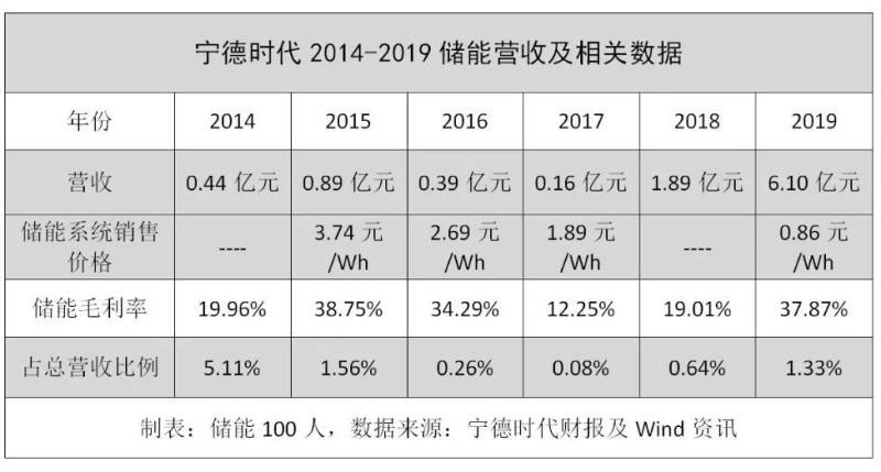 “儲(chǔ)能100人”翻閱寧德時(shí)代歷年財(cái)報(bào)發(fā)現(xiàn),2014-2019這六年,儲(chǔ)能電池的營收在總營收比例占比分別為5.11%,1.56%,0.26%,0.08%,0.64%,1.33%,儲(chǔ)能業(yè)績起伏較大。