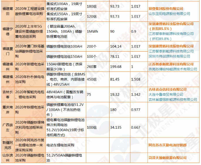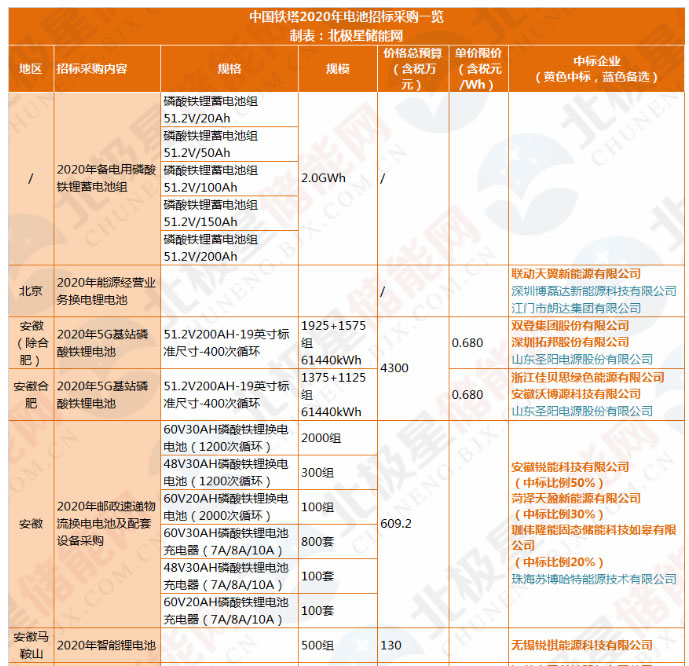 據(jù)北極星儲能網(wǎng)統(tǒng)計,中國鐵塔2020年已在13省發(fā)布了共28項磷酸鐵鋰電池相關招標,其中以2020年備電用磷酸鐵鋰集中采購規(guī)模最大、預計采購2GWh,預計采購額超10億元。除該項集中采購外,2020年截至目前我們統(tǒng)計到的各省市累計發(fā)布招標限最高限額已超1.6億元,安徽、廣東、河北等省份都發(fā)布了針對5G基站備電磷酸鐵鋰電池大規(guī)模招標,尤以安徽采購需求量最大、總采購額4300萬元,采購磷酸鐵鋰電池規(guī)模約61MWh,其次廣東僅一項針對5G基站的補充采購額就達4020萬元。