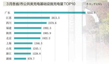 3月,全國公共類充電基礎(chǔ)設(shè)施充電總電量約2.9億kWh(不含國網(wǎng)),較上月回升1.2億kWh,同比減少11.7%,環(huán)比增加67.8%,疫情對充電運(yùn)營行業(yè)影響依然持續(xù)。全國充電電量主要集中在廣東、江蘇、四川、福建、陜西、北京、上海、山東、浙江、湖南、山西等地。其中,廣東充電量最高,達(dá)到5222.5萬kWh,這主要是當(dāng)?shù)毓渤潆姌逗统潆娬緮?shù)量都比較多。從電量流向看,以公交車為主,乘用車也有較大比重,環(huán)衛(wèi)車、物流車、出租車等其他類型車輛占比較小。