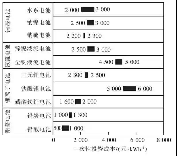 一次性投資成本指初始設(shè)備總投資,對(duì)于電池儲(chǔ)能系統(tǒng)來(lái)說(shuō),包含儲(chǔ)能變流器、電源管理系統(tǒng)、儲(chǔ)能電池、消防裝備、監(jiān)控系統(tǒng)等。除鉛酸電池之外,鉛炭電池一次性投資成本1 000~1 300元/kWh,為各類(lèi)技術(shù)最低。磷酸鐵鋰和三元鋰電池受電動(dòng)汽車(chē)產(chǎn)業(yè)的推動(dòng),成本下降速度極快。磷酸鐵鋰一次性投資成本1 600~2 000 元/kWh,多數(shù)供應(yīng)商出廠成本約1 800 元/kWh,見(jiàn)圖3。