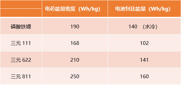 表3是磷酸鐵鋰電池包和三元電池包能量密度的比較: