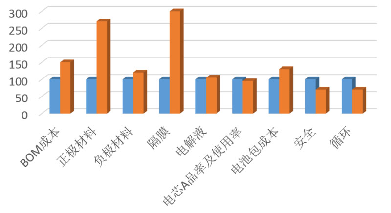 圖2 | 磷酸鐵鋰電池和三元電池綜合成本及性能比較。藍(lán)色方柱為磷酸鐵鋰,橘紅色方柱為三元材料,依次為:電芯BOM成本、正極材料、負(fù)極材料、隔膜、電解液、電芯A品率、電池包成本、安全性能、循環(huán)性能。