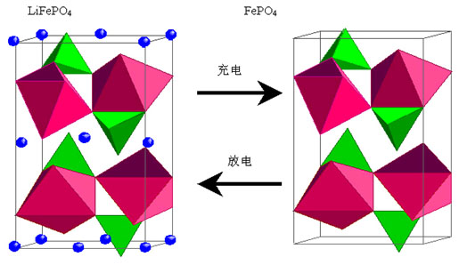 圖1 | 磷酸鐵鋰材料的結(jié)構(gòu)示意圖。紅色三維圖為Fe-O八面體,綠色為P-O四面體,藍(lán)色小球?yàn)殇囯x子。即使在過(guò)充電情況下,LiFePO4變成FePO4,其結(jié)構(gòu)也是非常穩(wěn)定的,無(wú)氧氣放出。